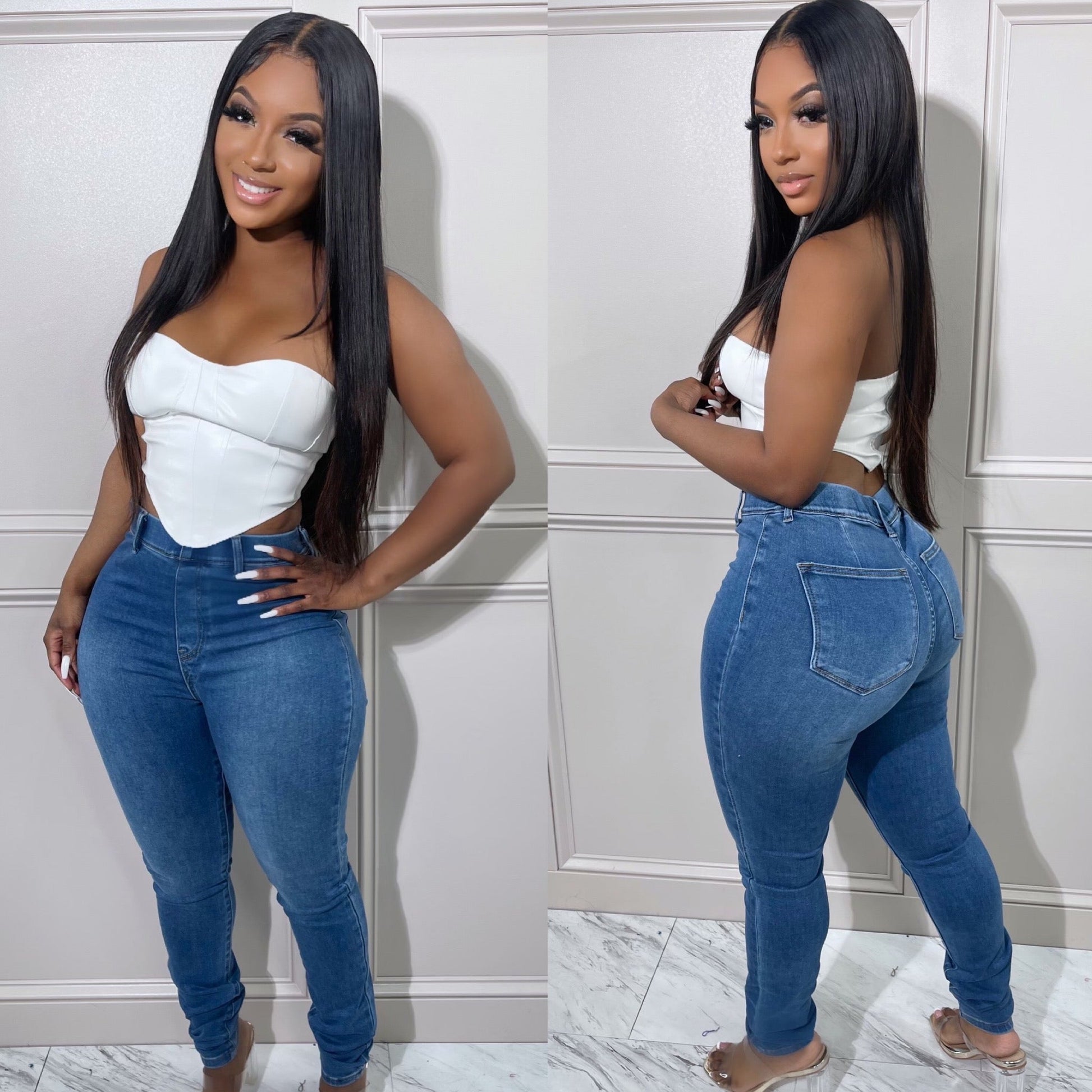 These super flex jeans features, a stretch denim fabric, high waist, pockets,  easy pull up with no zippers, elastic waist with belt loops.